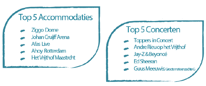 Verreweg de meeste concerten vinden plaats in de concertaccommodaties Ziggo Dome en Afas Live. In Amsterdam vonden in 119 grote concerten plaats, de stad heeft daarmee een marktaandeel van 61%. De stadionconcerten in de Johan Cruijff ArenA trokken de meeste bezoeken (354.000), gevolgd door het Arnhemse GelreDome en het Philips Stadion in Eindhoven (met dank aan Guus Meeuwis). De bezoekaantallen van de concerten van o.a. Justin Timberlake en Iron Maiden, zorgden ervoor dat GelreDome het Philips Stadion in 2018 voorbij is gestreefd.