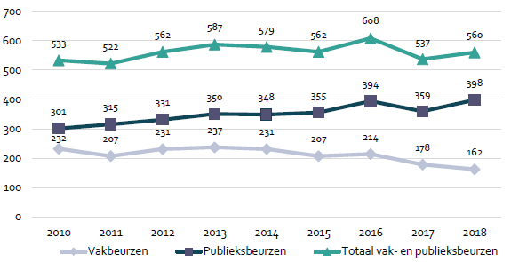 Het totaal aantal beurzen is sinds 2010 ongeveer gelijk gebleven, maar de verdeling naar publieks- en vakbeurzen is opvallend gewijzigd. Het aantal publieksbeurzen is de afgelopen 8 jaar met 30% gestegen, terwijl het aantal vakbeurzen met 32% is afgenomen.