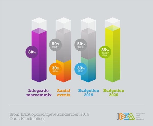 Hogere budgettenOok de budgetten geven een stabiel en positief beeld. 33 procent van de bedrijven zegt in 2019 meer aan eventmarketing en livecommunicatie te hebben besteed. Bij 50 procent van de opdrachtgevers is het budget gelijk gebleven. Voor 2020 zal deze trend zich volgens de onderzochte bedrijven voortzetten: bij 85 procent van de opdrachtgevers zullen de budgetten stijgen of gelijk blijven.