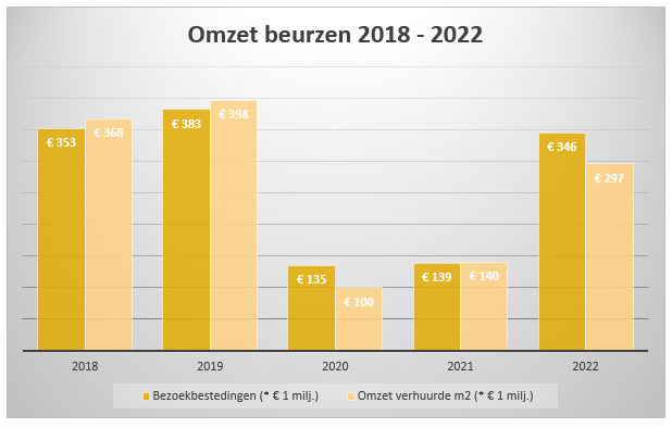 De 441 vak- en publieksbeurzen trokken in totaal 3,9 miljoen bezoeken. Dat is 33% minder dan in 2019. De grootste daling was te zien bij de publieksbeurzen waar in 2022 36% minder bezoekers werden verwelkomd in vergelijking met 2019. Bij de vakbeurzen lag dat percentage op -26%.