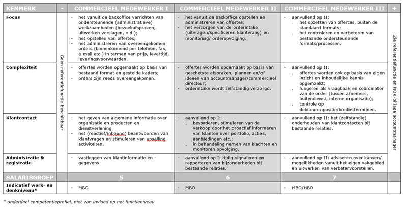 Voor referentiefuncties die op meerdere niveaus voorkomen, zoals bijvoorbeeld de commercieel medewerker (drie niveaus), is een zogeheten matrix met Niveau-Onderscheidende Kenmerken (NOK) opgesteld.